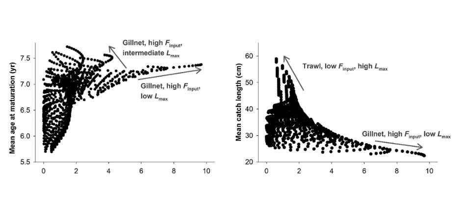 Potential trade-offs between major management objectives: while there is a clear conflict between total yield of a fishery and the mean fish length in the catch (right side), gillnet-type selectivity can resolve yield maximization and mitigation/reversal of evolutionary impacts in a zone of consensus (left side). All points represent an end point of a simulation using a specific management regime.