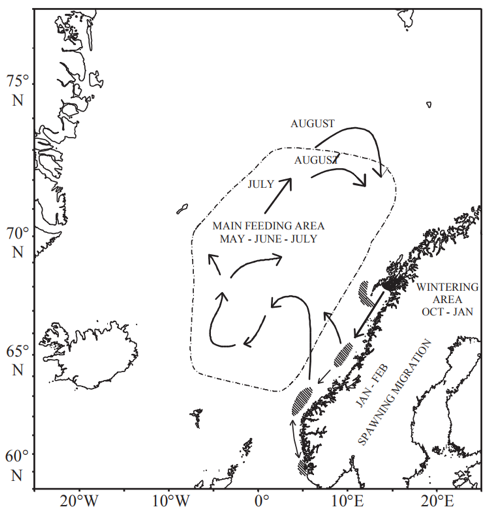 Figure 1: General migration pattern of adult herring during the last decade (from Kvamme et al. 2003).